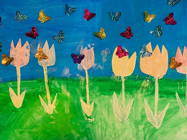 草間が20歳頃に描いた、自身の心象風景を描いているとも言える作品《残夢》を見て、自分が思ったことを自由に話した後、お絵かきとコラージュに挑戦しました。昨日見た夢や、楽しかった思い出の風景、想像上の生き物と自分など…思い浮かんだことを、自分ならではの『心の中の景色』として描きました。